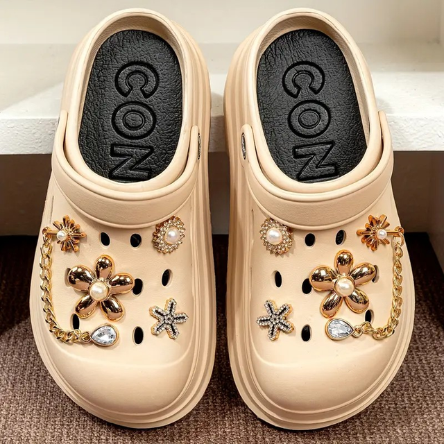 Women's Chunky Platform Sandals with Golden Chain & Heart Charm - EVA Slip-On Beach Shoes, Comfortable Thick Sole for Outdoor, Wedding, Casual Wear - Hand Wash Only
