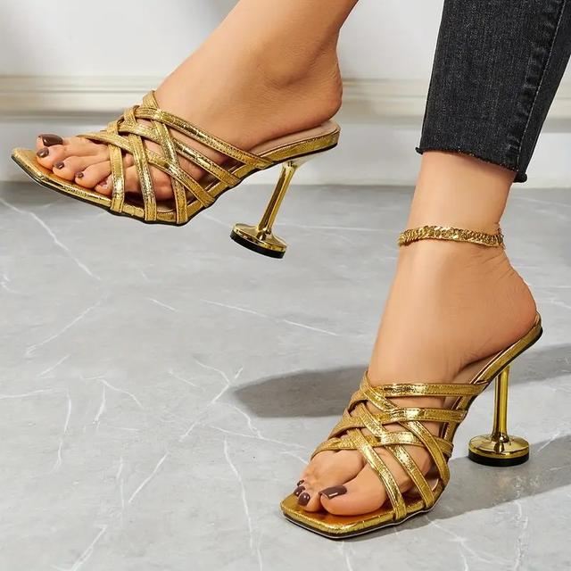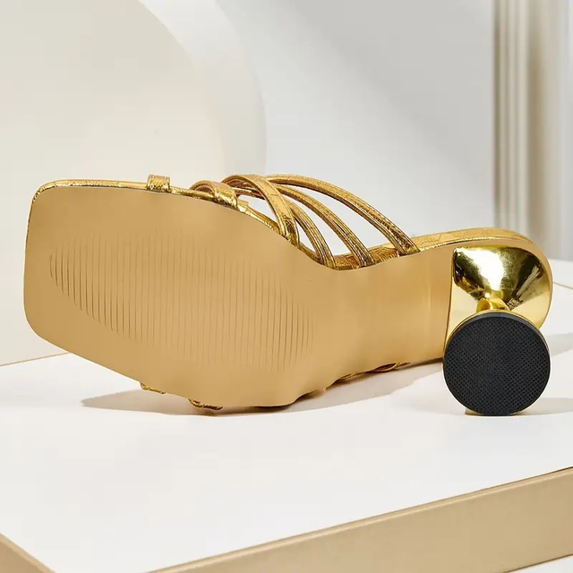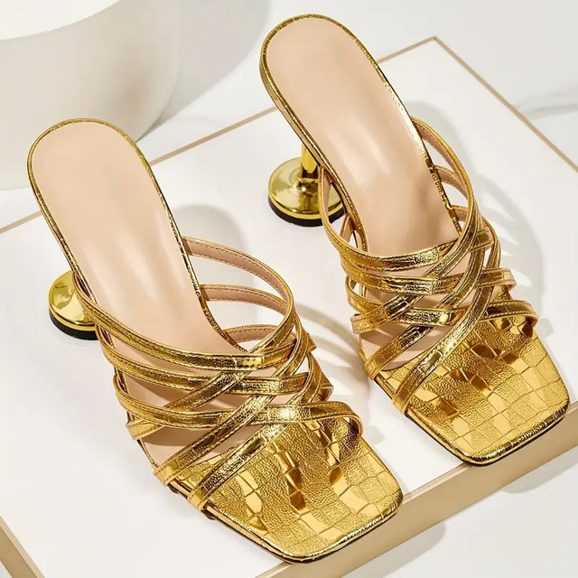 Women'S Elegant Golden-Embroidered Strappy Sandals with Square Toe - Stylish High Heel, Open Back, Rubber Sole, Summer Casual Wear, Casual Sandals|Elegant Strappy Sandals|Rubber Sole Sandal
