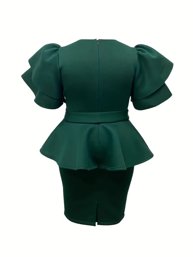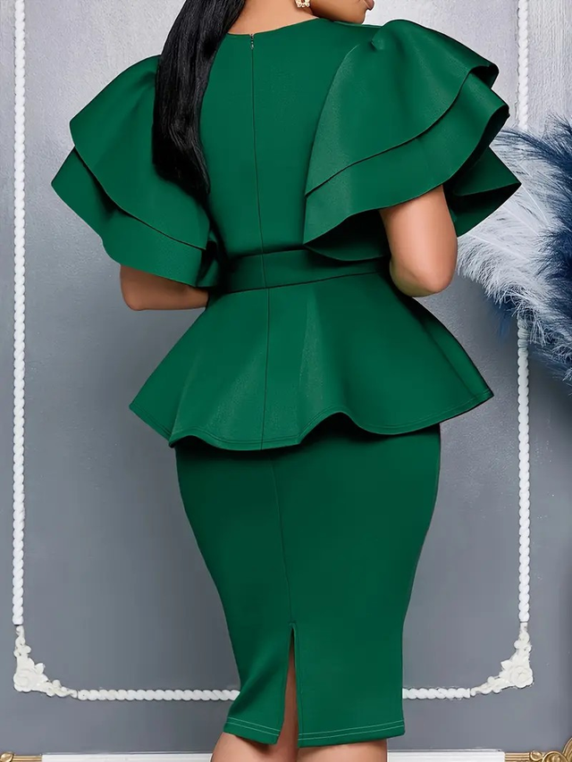Elegant Green V-Neck Bodycon Dress with Ruffle Sleeves and Belted Waist Detail - Stretchy Polyester Blend, Side Slit, Perfect for All Seasons, Evening Wear|Ruffle Detail|Bodycon Dress