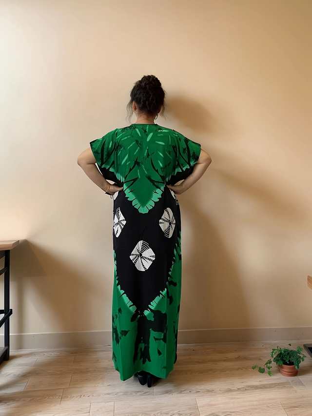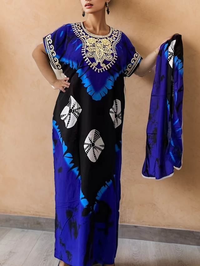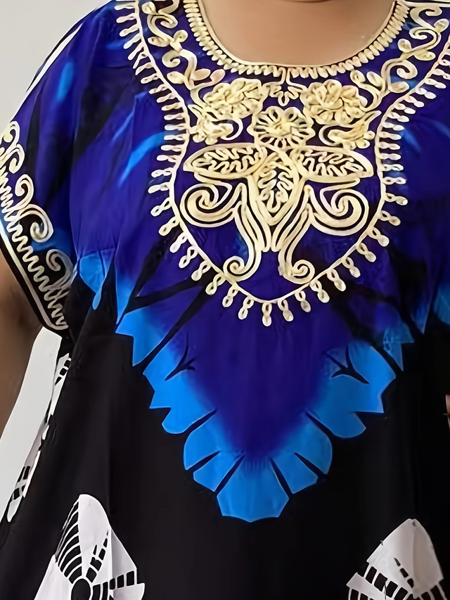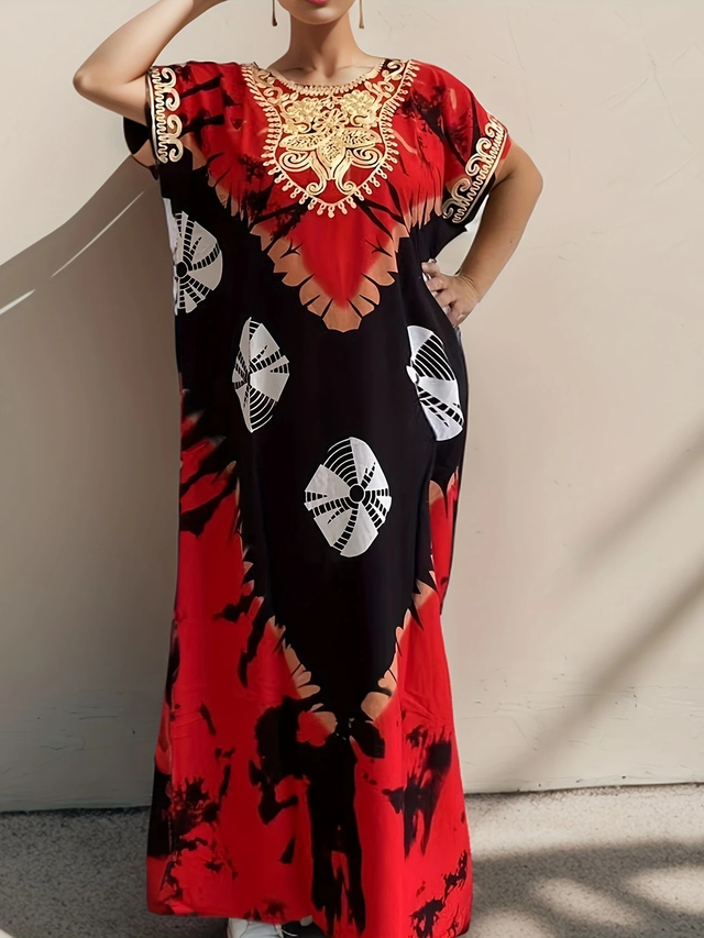 Elegant Women'S Kaftan Dress - Loose Fit, Floral Print, Round Neck, Short Sleeve, Plus Size, Traditional Middle Eastern Style, Red & Black