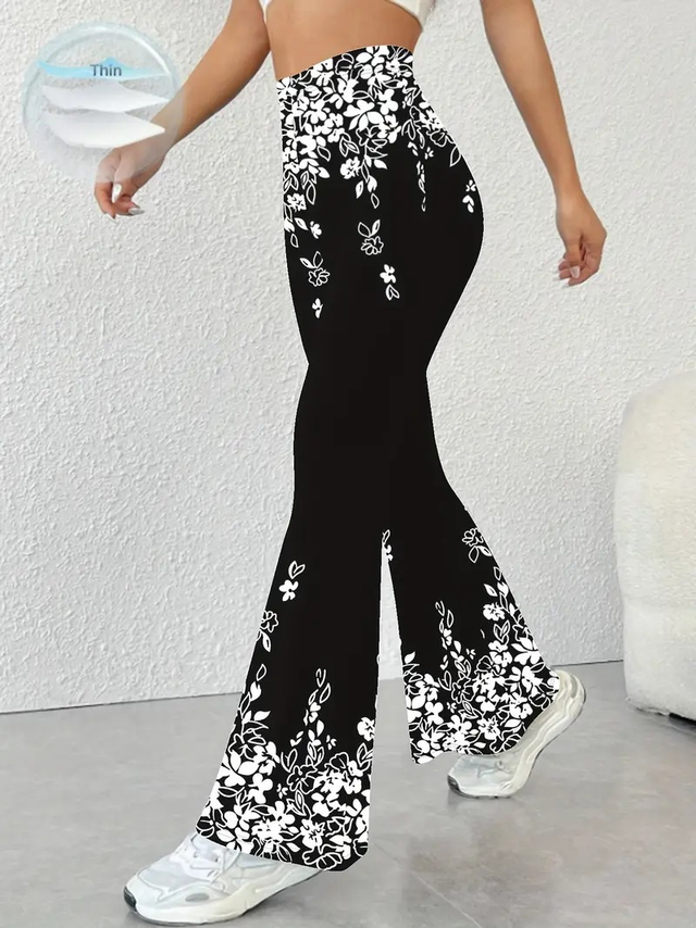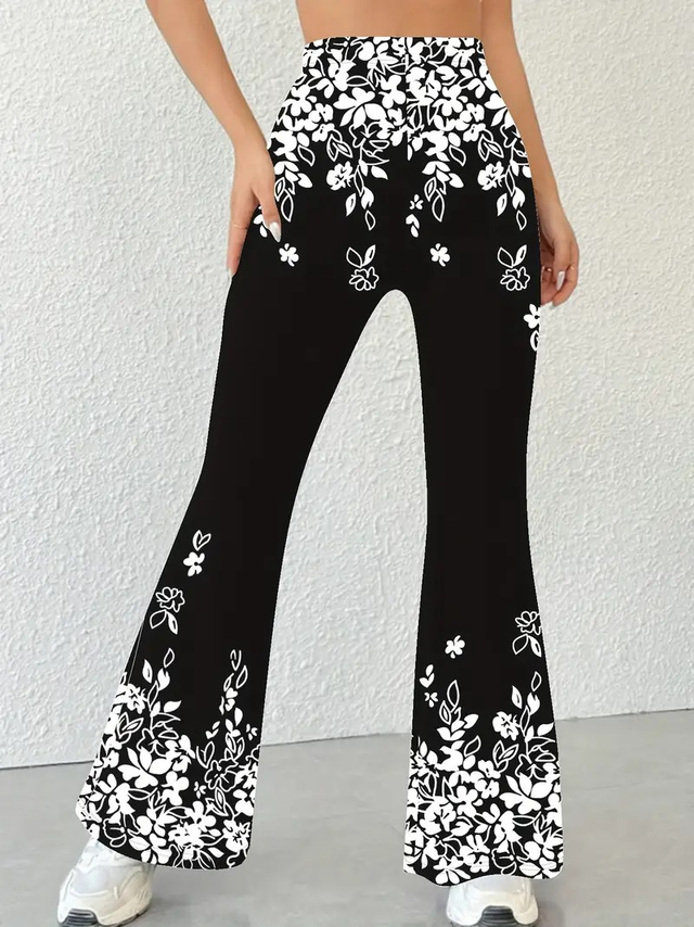 Women's High-Waisted Flared Pants with Black & White Floral Print - Stretchy Elastic Waistband, All-Season Machine Washable Trousers for Casual & Formal Wear - Elegant Women's Fashion, Cute Pants, Comfortable Clothing, Nontransparent Fabric, Versatile Bottoms, Stylish Bottoms, Durable Material, Fashion Lovers