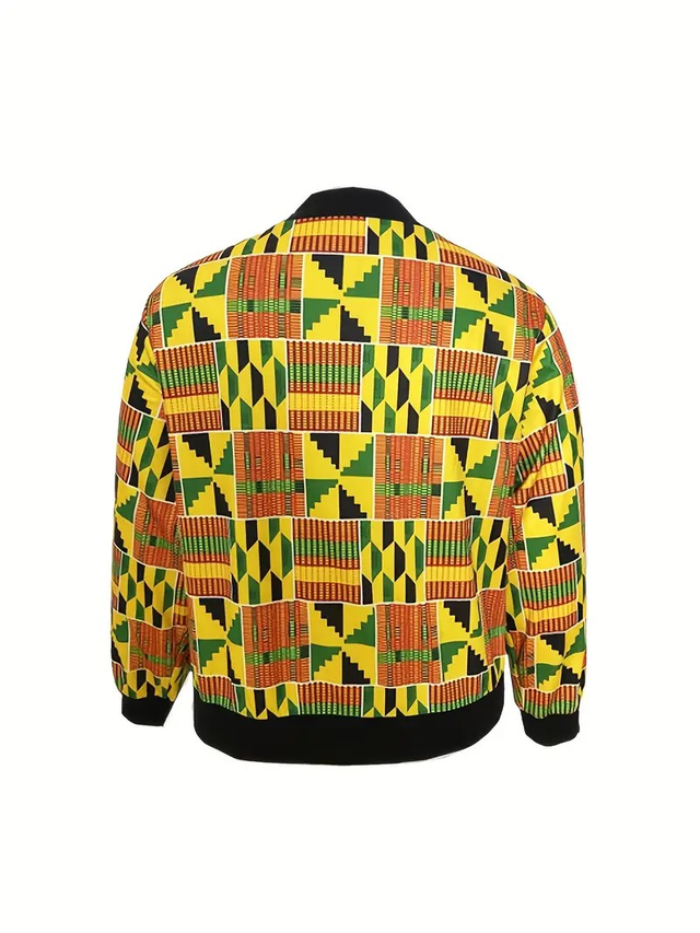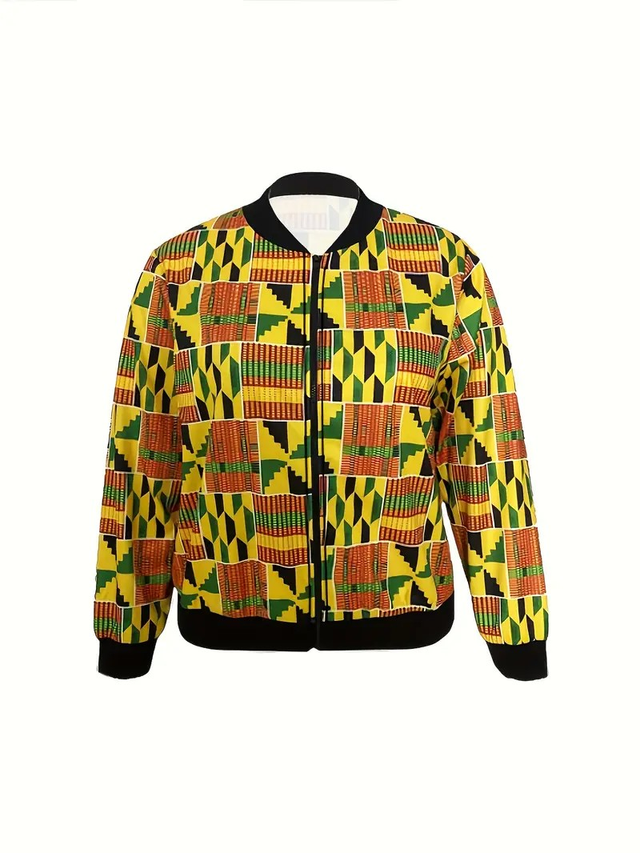 Plus Size Casual Jacket, Women's Plus Allover Geometric Print Long Sleeve Full Zipper Bomber Jacket With Pockets