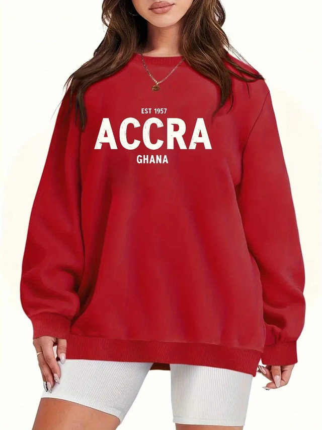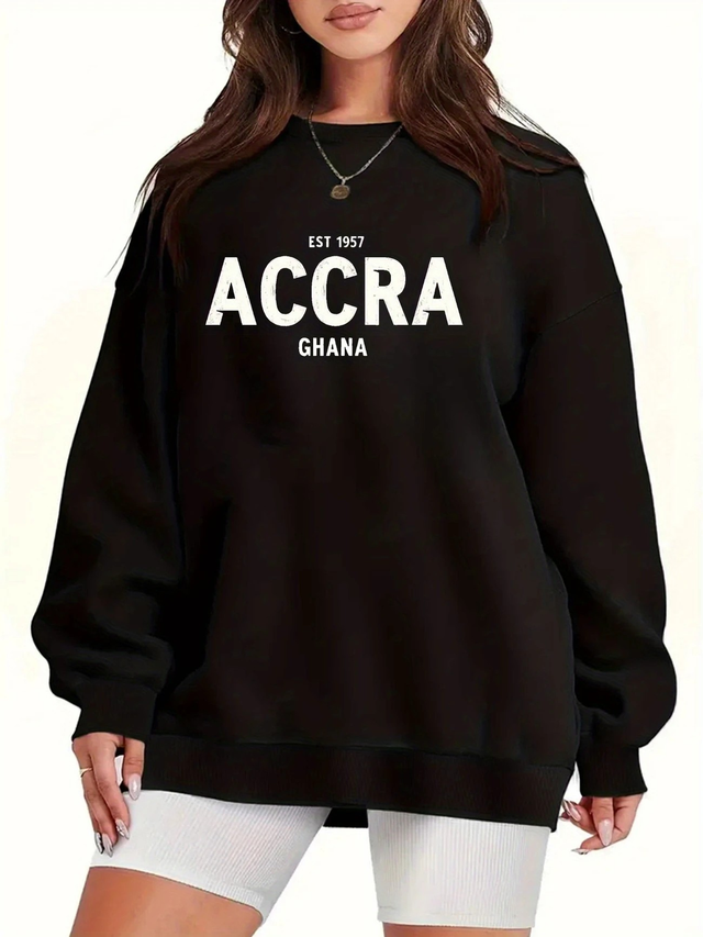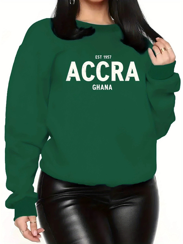 Women'S Plus Size Casual Sweatshirt - "Accra Ghana" Bold Letter Print, Black Crew Neck, Fall/Winter Style, Non-Stretch Fabric, Fall Winter Apparel | Bold Letter Print Top | Comfortable Fit, Plus Size Sweater, PLUS SIZE