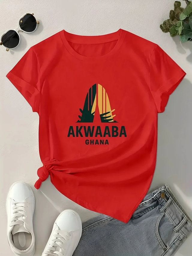 Plus Size Women's Ghanaian Cultural Graphic Print T-Shirt - Vibrant Red AKWAABA Design with Traditional Symbols, Short Sleeve Crew Neck Casual Top, Machine Washable All-Season Comfort, Everyday Comfort, Bold Statement Shirt, Knotted Waist Style