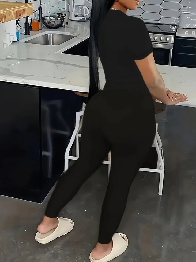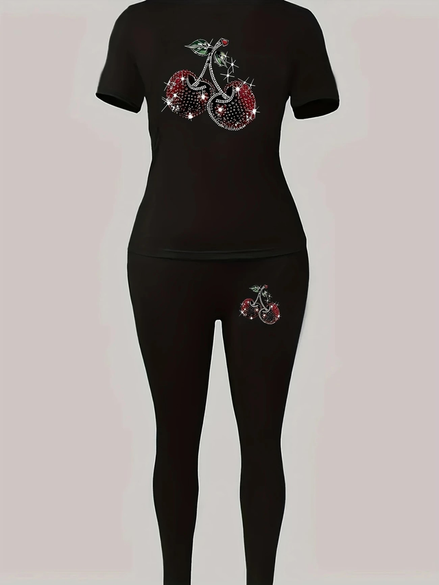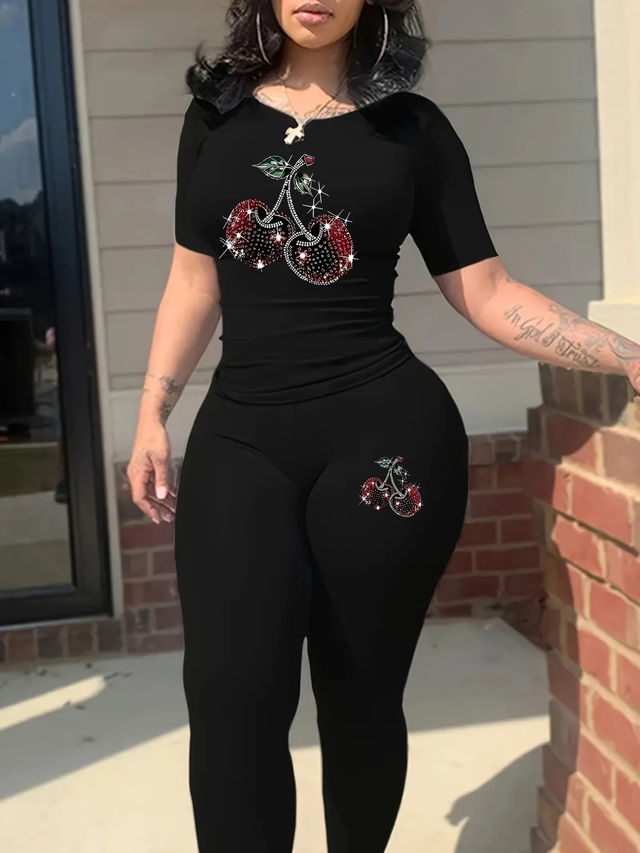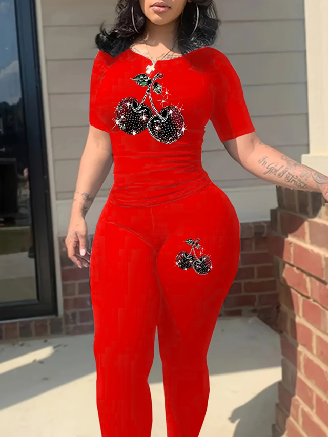 Women'S Red Bodycon Jumpsuit with Cherry Print - Stretchy, Short Sleeve, Round Neck Casual Sportswear Set for Spring and Fall, Casual Sportswear | Playful Print Jumpsuit | Stretchy