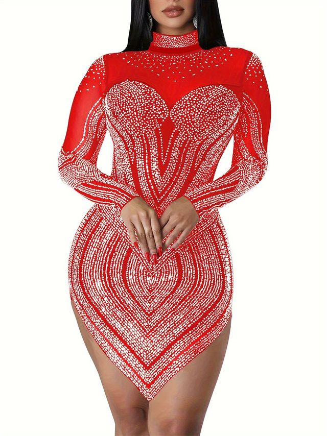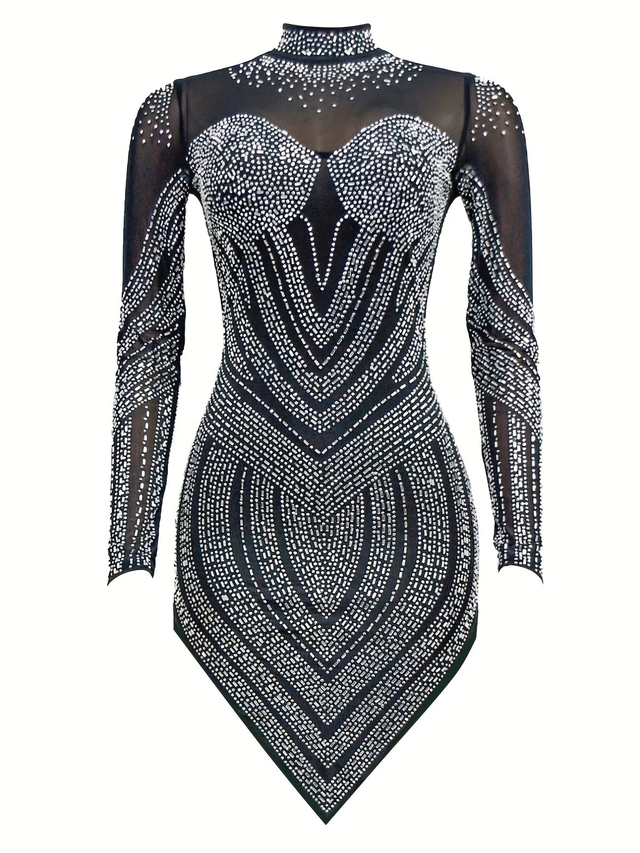 Rhinestone Semi-Sheer Dress, Sexy High Neck Long Sleeve Bodycon Party Dress, Women's Clothing