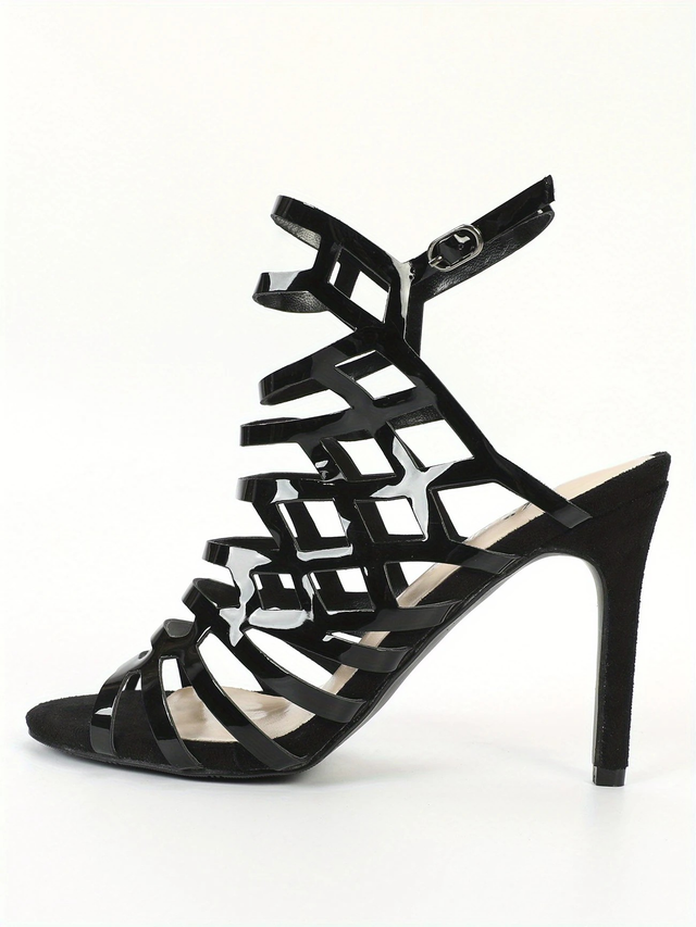 Women'S Sexy Open Toe High Heel Sandals, Black Hollow-Out Chunky Heel with Buckle Closure, Man-Made Upper, Microfiber Insole, Artificial Lining, Rubber Sole - Party Footwear