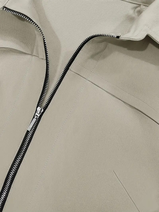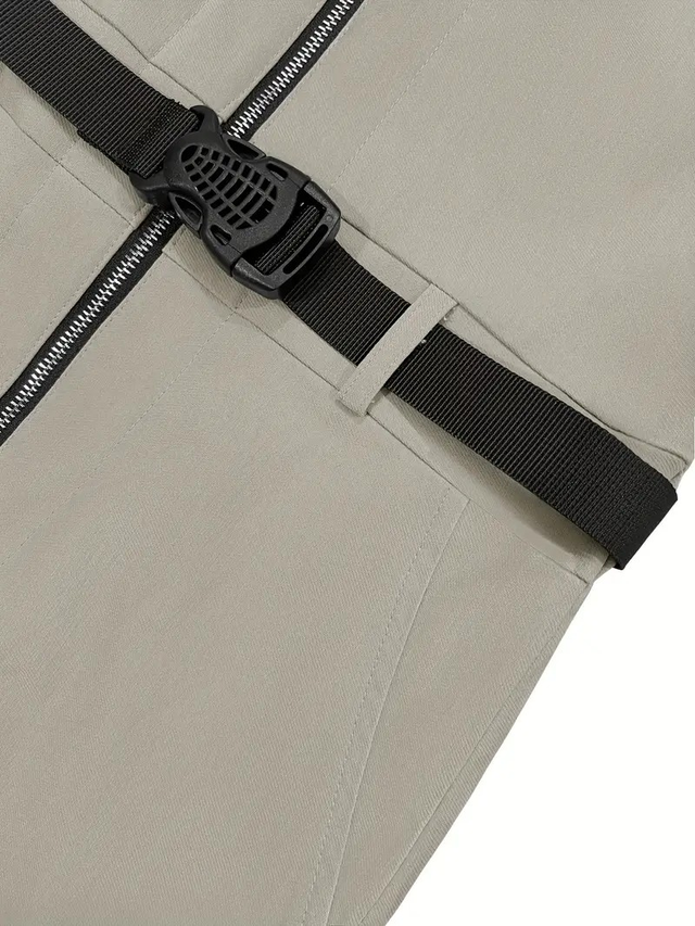 Women's Slim-Fit Zip-Up Jumpsuit with Belt - Short Sleeve Casual Romper in Solid Color Beige, Elastic Waist & Cuffed Ankle Pants, Machine Washable All-Season Outfit with Pockets, Ladies Rompers And Jumpsuits, Casual Attire, High Collar Style, Smooth Texture Fabric