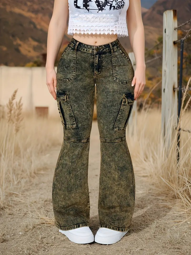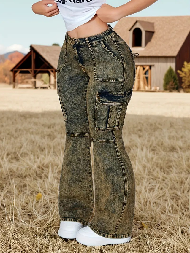 Women'S Stretch Denim Flare Jeans - Comfortable Casual Long Pants with Pockets, Mid-Rise, Light Wash, All-Season Wear, Jean Pants