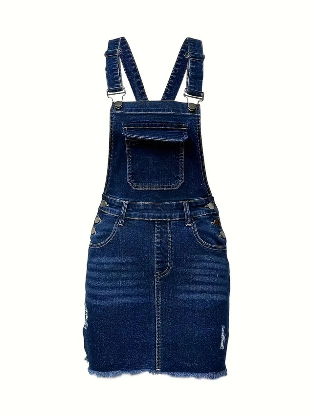 A Women'S Stretchy, Washed Denim Overall Dress in Blue, Featuring Casual Long Pants with Pockets, Frayed Hem Design, Adjustable Gourd Buckle, Multiple Distressed Details, a Fitted Silhouette, Suitable for Spring, Summer, And Autumn, Comfortable And Elegant Women'S Wear, Machine Washable, Perfect for Travel And Shopping, Women'S Denim Overall Dress And Clothing.