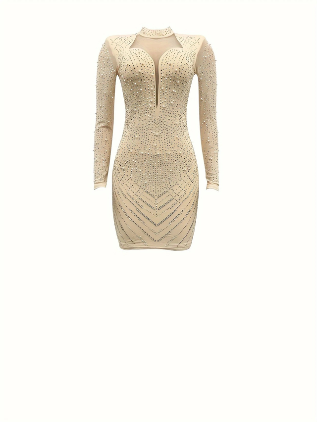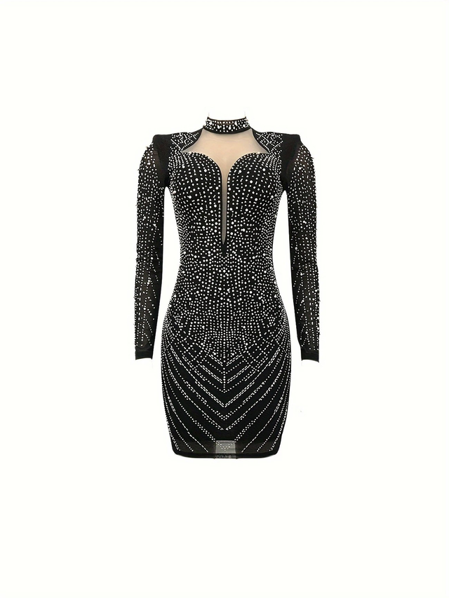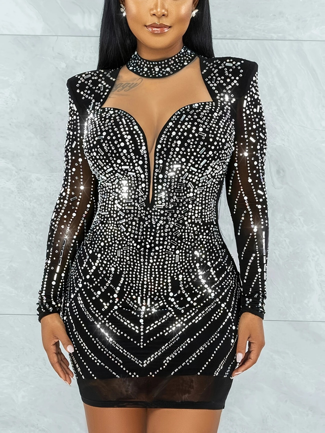 Women's Stylish Sexy Deep V Neck Rhinestone Mesh Sheer Dress