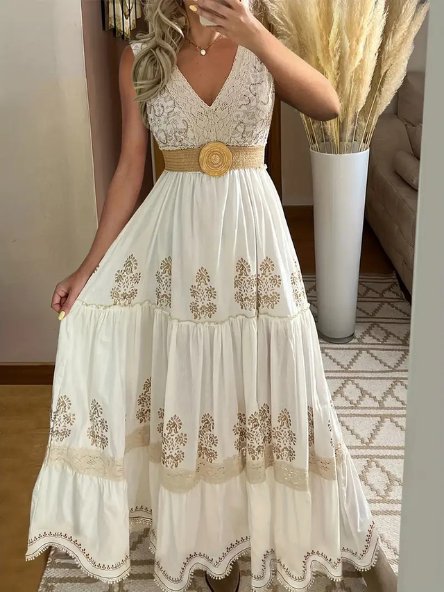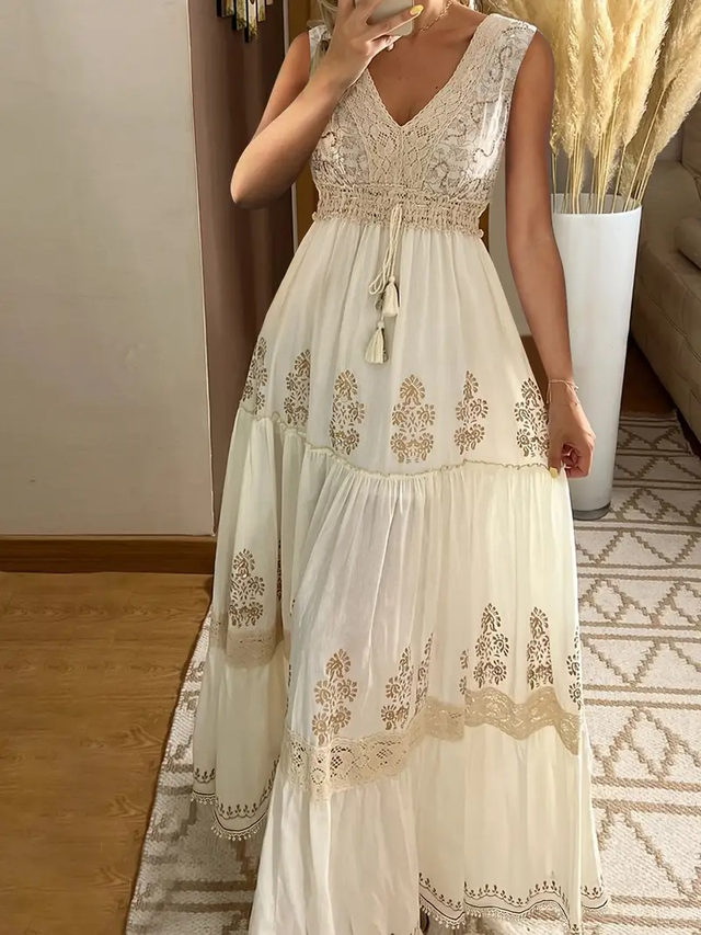 [Vintage Lace Dress] Lightweight Breathable Vintage Floral Lace V-Neck Flare Sleeve Tiered Maxi Dress | Non-Stretch Fabric, Hand Wash Only, Spring Summer Fall Women's Casual & Formal Dress, Lace Dress, Seasonal Fashion, Intricate Embroidery, Vacation Outfit, Delicate Stitching, Elegant Wear