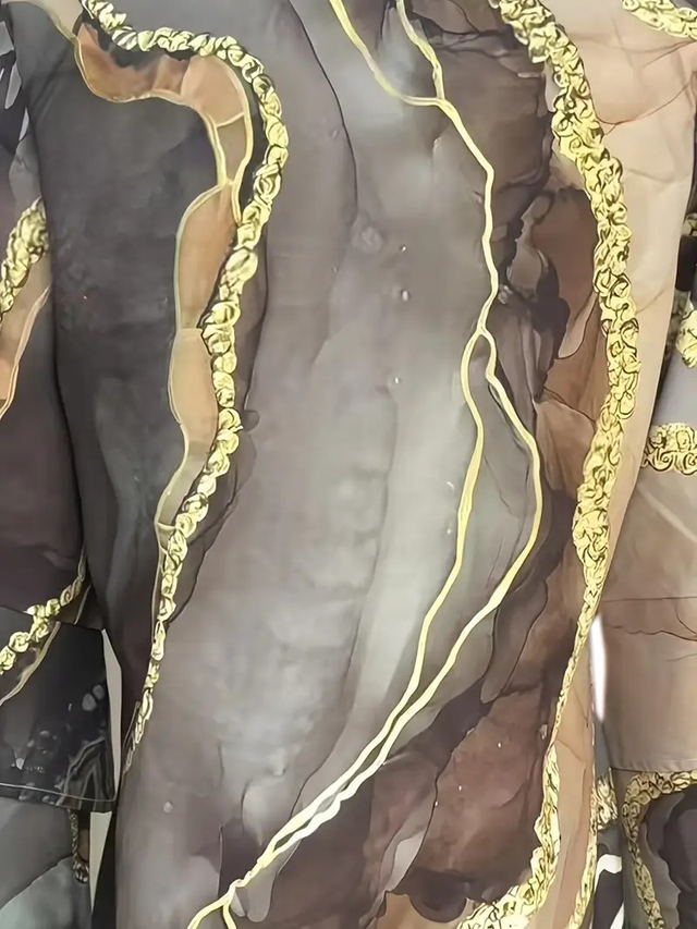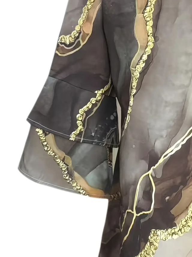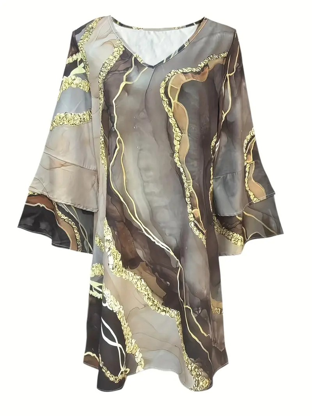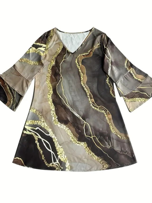 Print V-Neck Dress with Layered Bell Sleeves, A-Line Mid-Length for Women - Spring/Summer Collection, Loose Fit, Golden Accents, Perfect for Vacation or Casual Outings, Chic Dress, Summer Fashion, Comfortable Fashion
